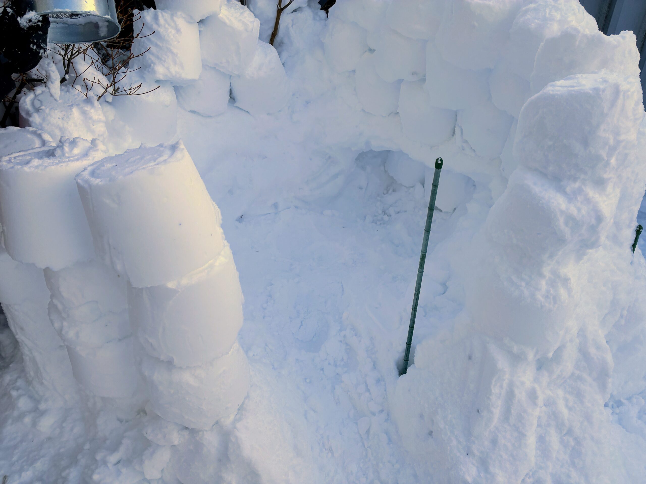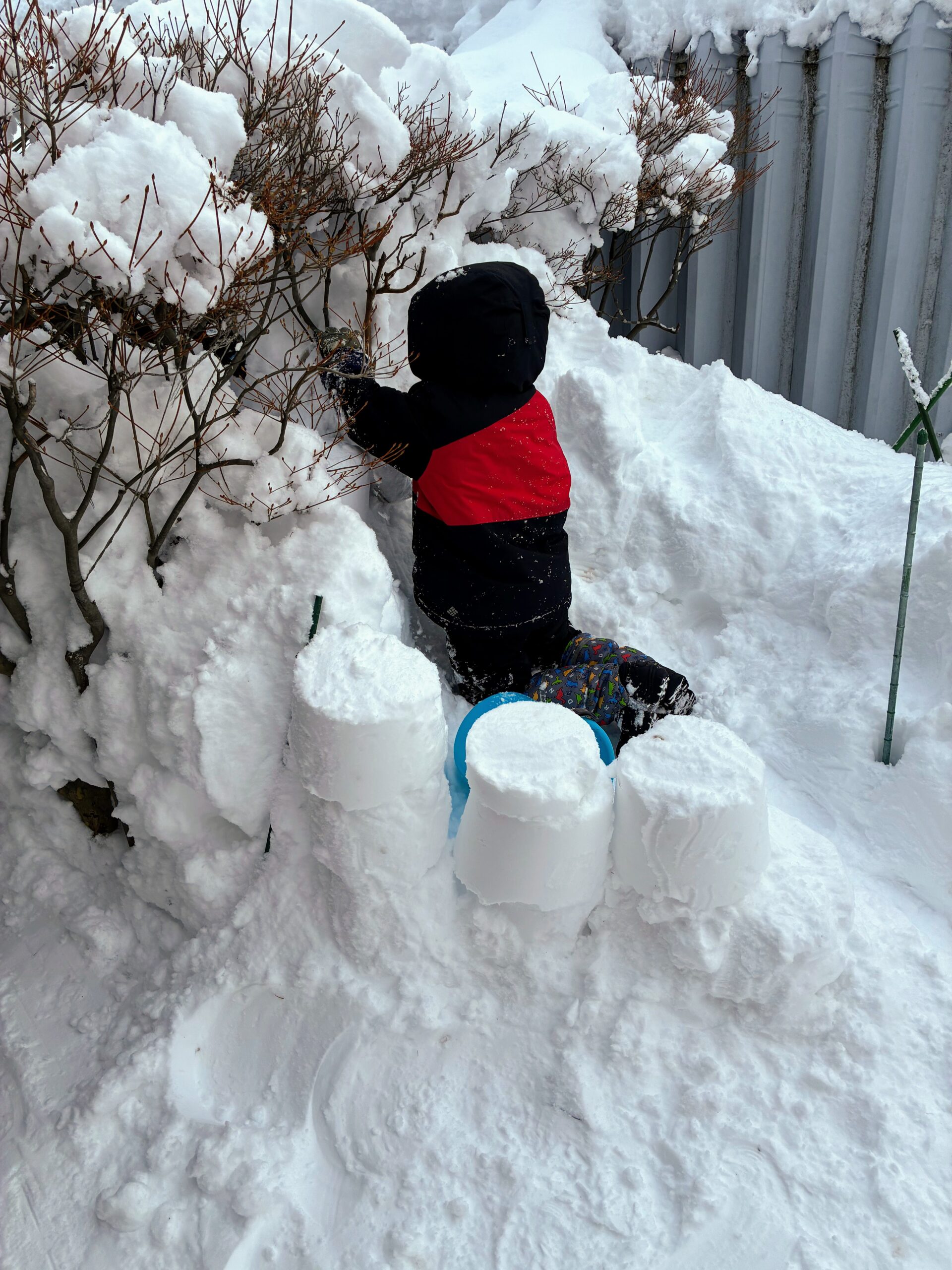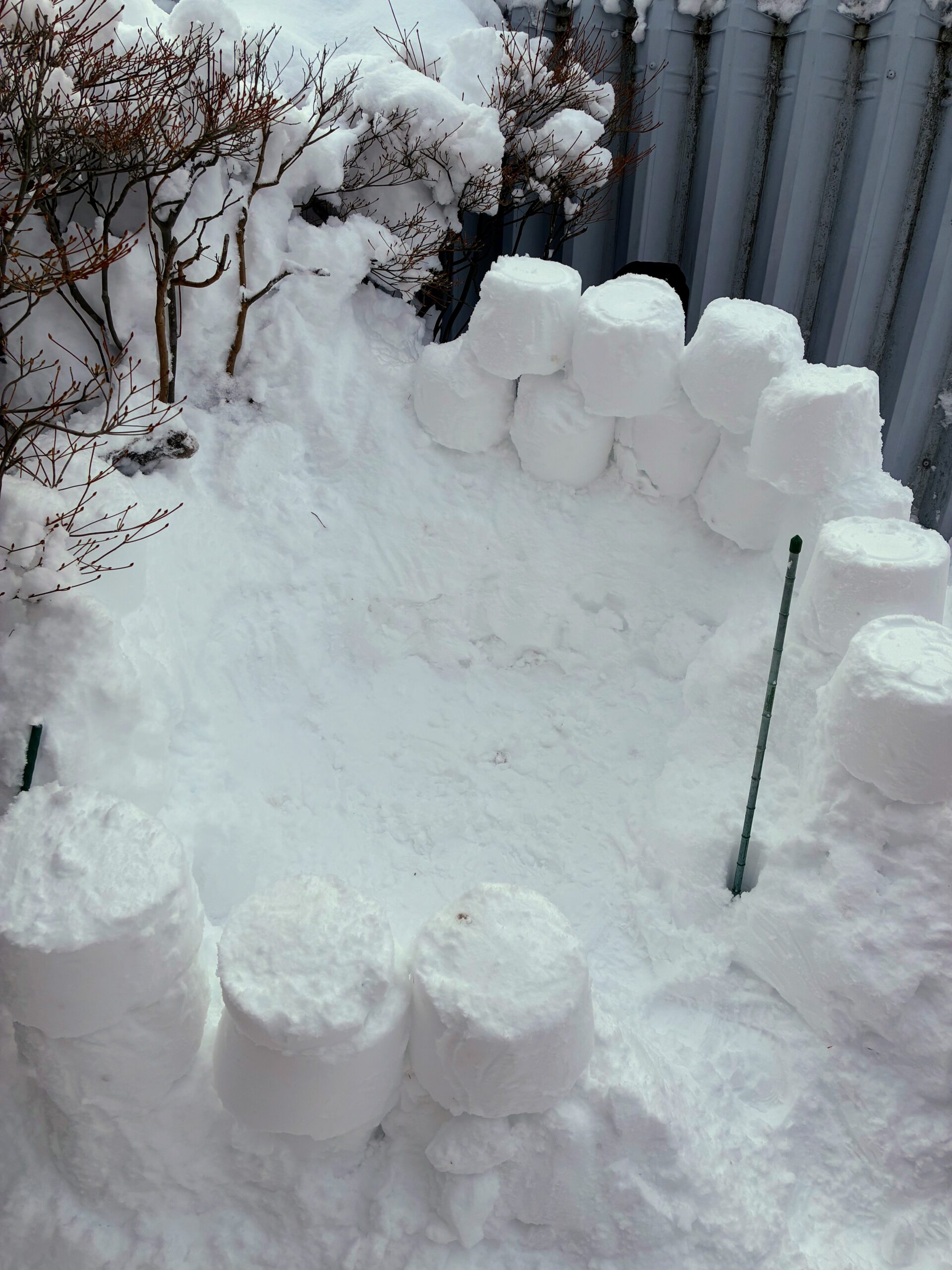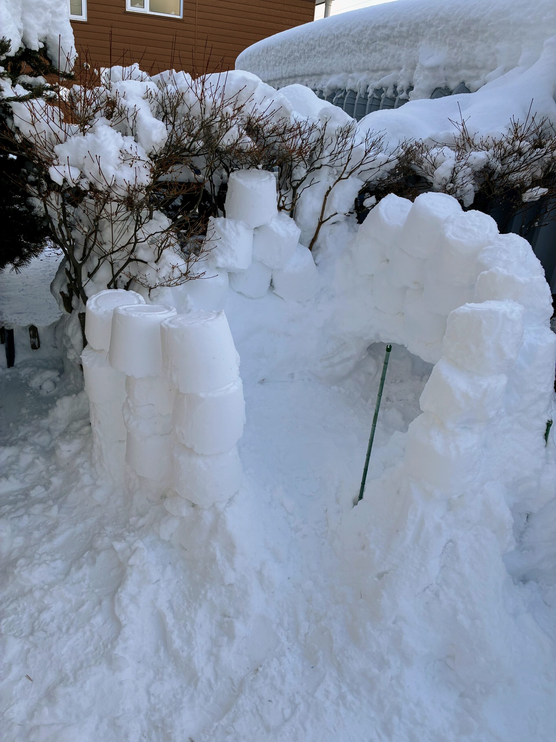 バケツは丸いのでどうしても隙間ができます。ですが、その隙間は後からなんとかすればいいかと考えていたようです。私にも“手伝って”と声がかかり、バケツで雪のブロックを作り長男に渡し続けました。