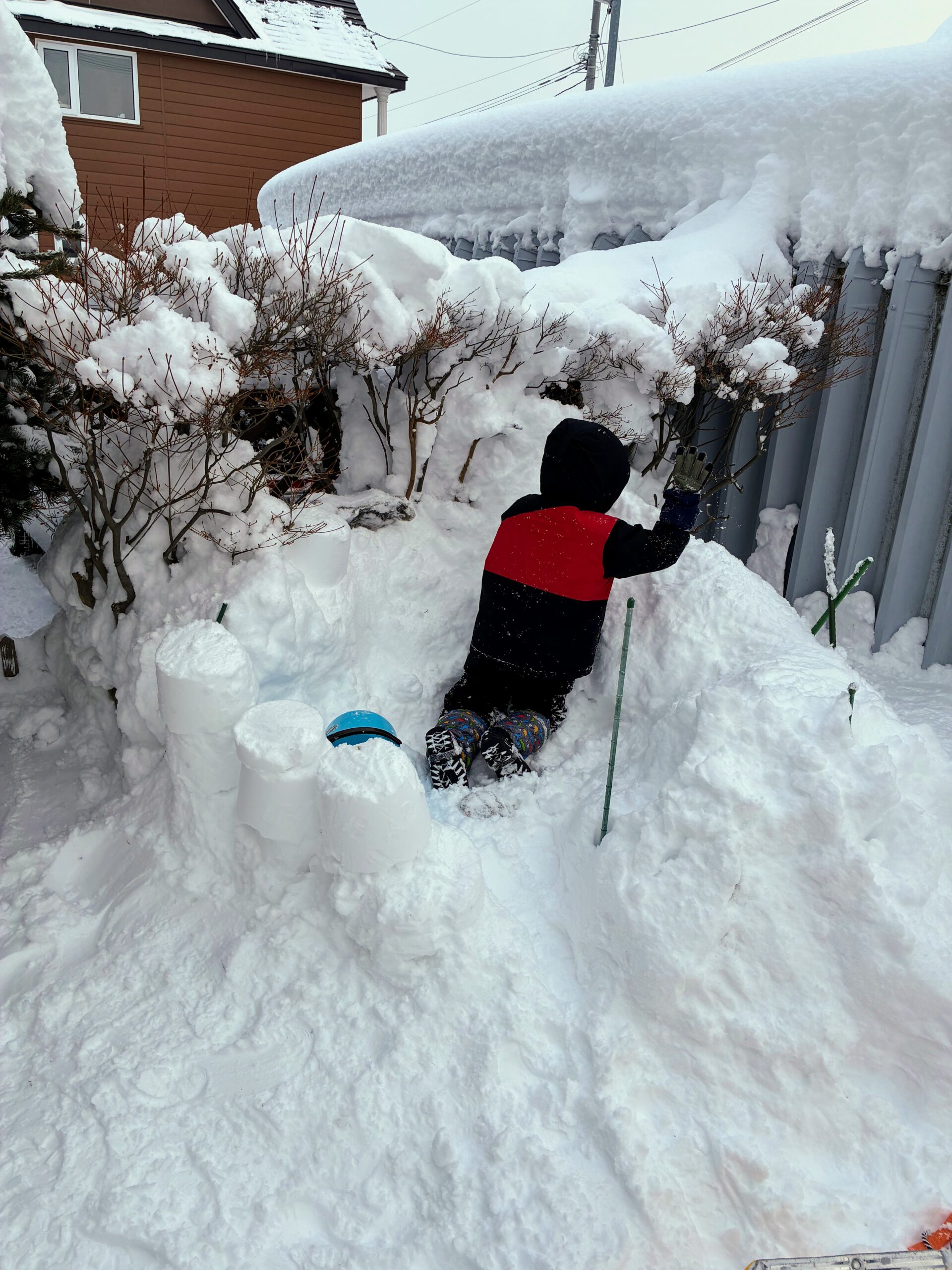 するとハッとしたように「崩れる・・・」と気付いた長男。そして「ブロック部分ではなくその下の積もっている雪部分を掘ればいいんだ」とまたまた発想転換してここ掘れワンワンスタイルで掘っていました。