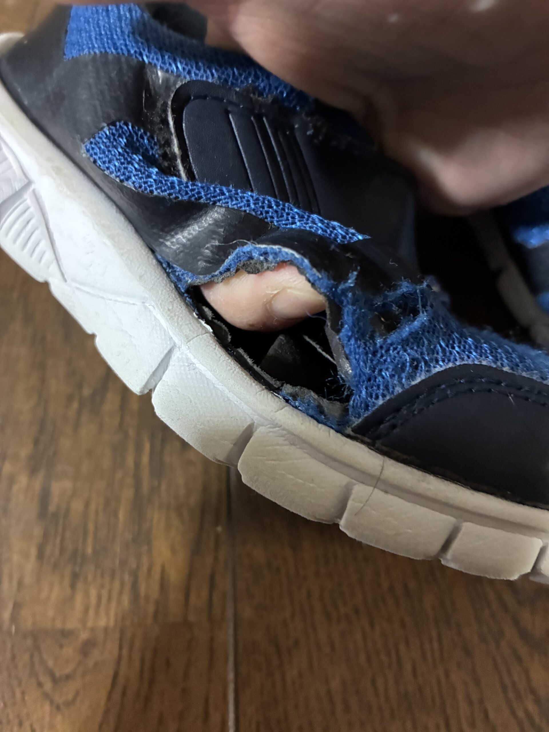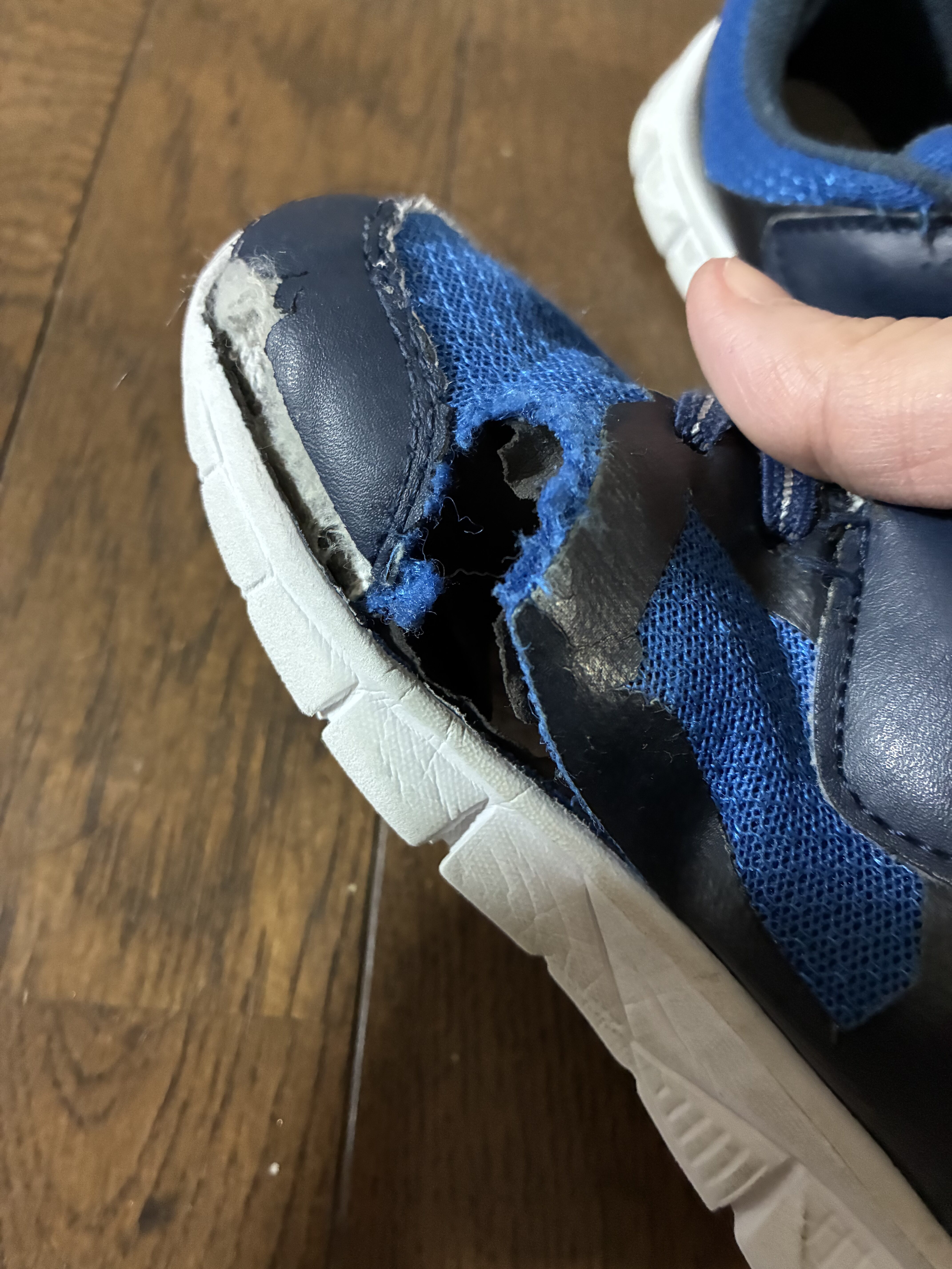 幼稚園で毎日履いていた靴に、穴があきました。つま先がすり減り、両側はぱっくり。。。